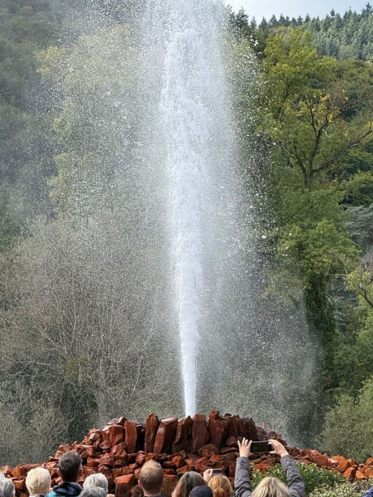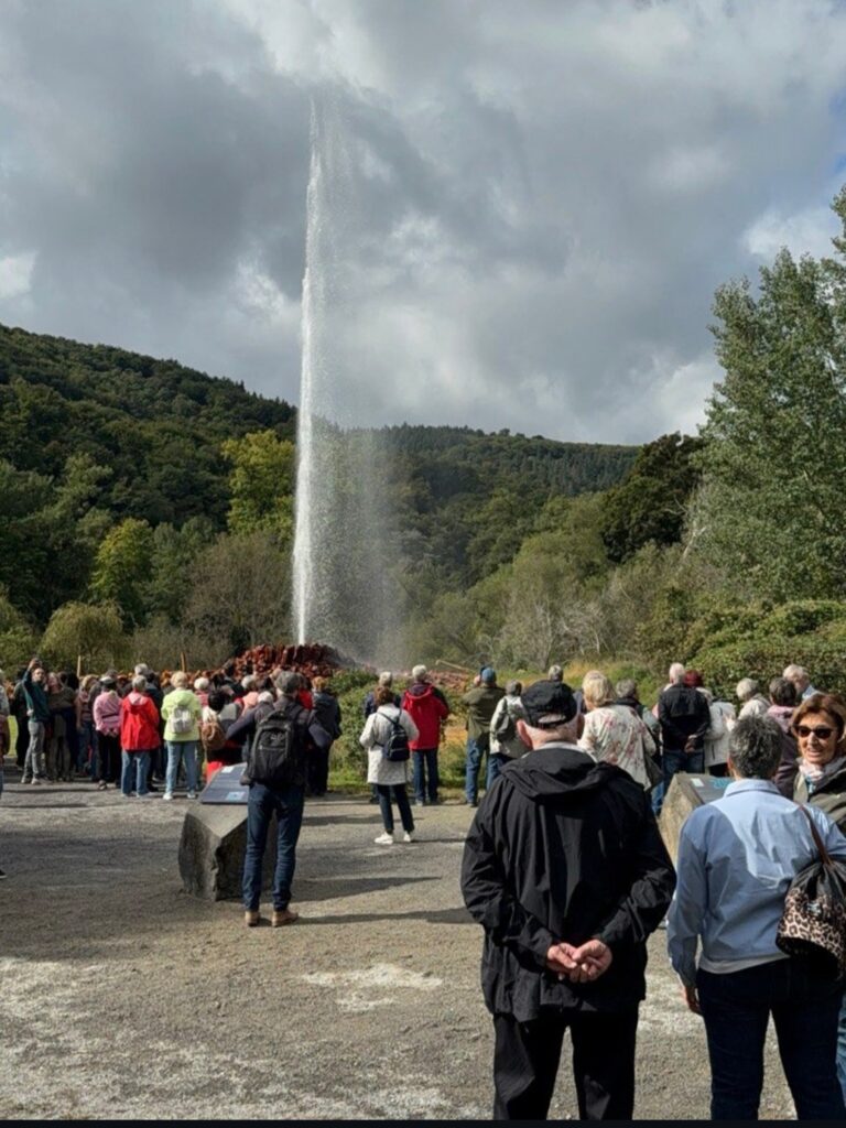 Im Anschluss folgte der praktische Teil der Exkursion. per Schiff ging es zur Halbinsel Namedyer Werth, wo die Gruppe den Ausbruch des Geysirs live miterleben konnte. Alle 100 Minuten schießt dort eine über 60 Meter hohe Fontäne kohlesäurehaltigen Wassers in den Himmel – ein beeindruckendes Naturschauspiel, das bei allen Teilnehmern für Staunen sorgte.